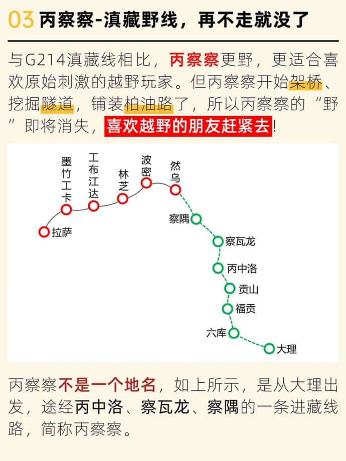 第三条:丙察察-滇藏野线,与G214滇藏线相比,丙察察更野,更适合喜欢原始刺激的越野玩家。