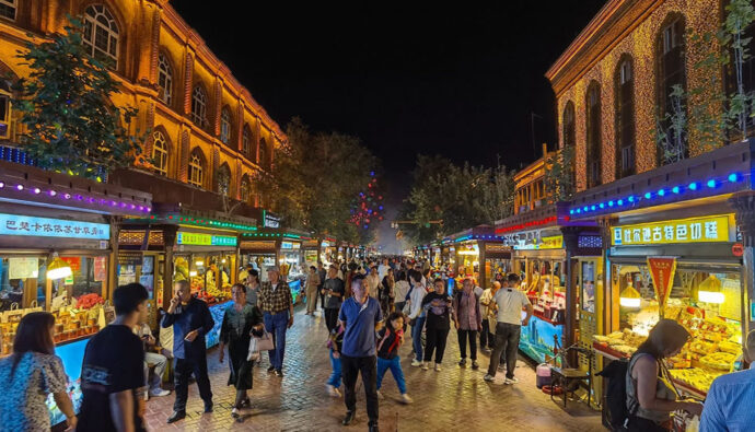 B. 汗巴扎夜市:特色菜品:烤鸡蛋、手工冰淇淋、石榴汁(一定要尝一尝,原汁原味)、各种切糕(颠覆你对这种高大上食品的理解)、各式烧烤、各类瓜果等,人均约40元起。地址:艾提尕尔清真寺广场的对面